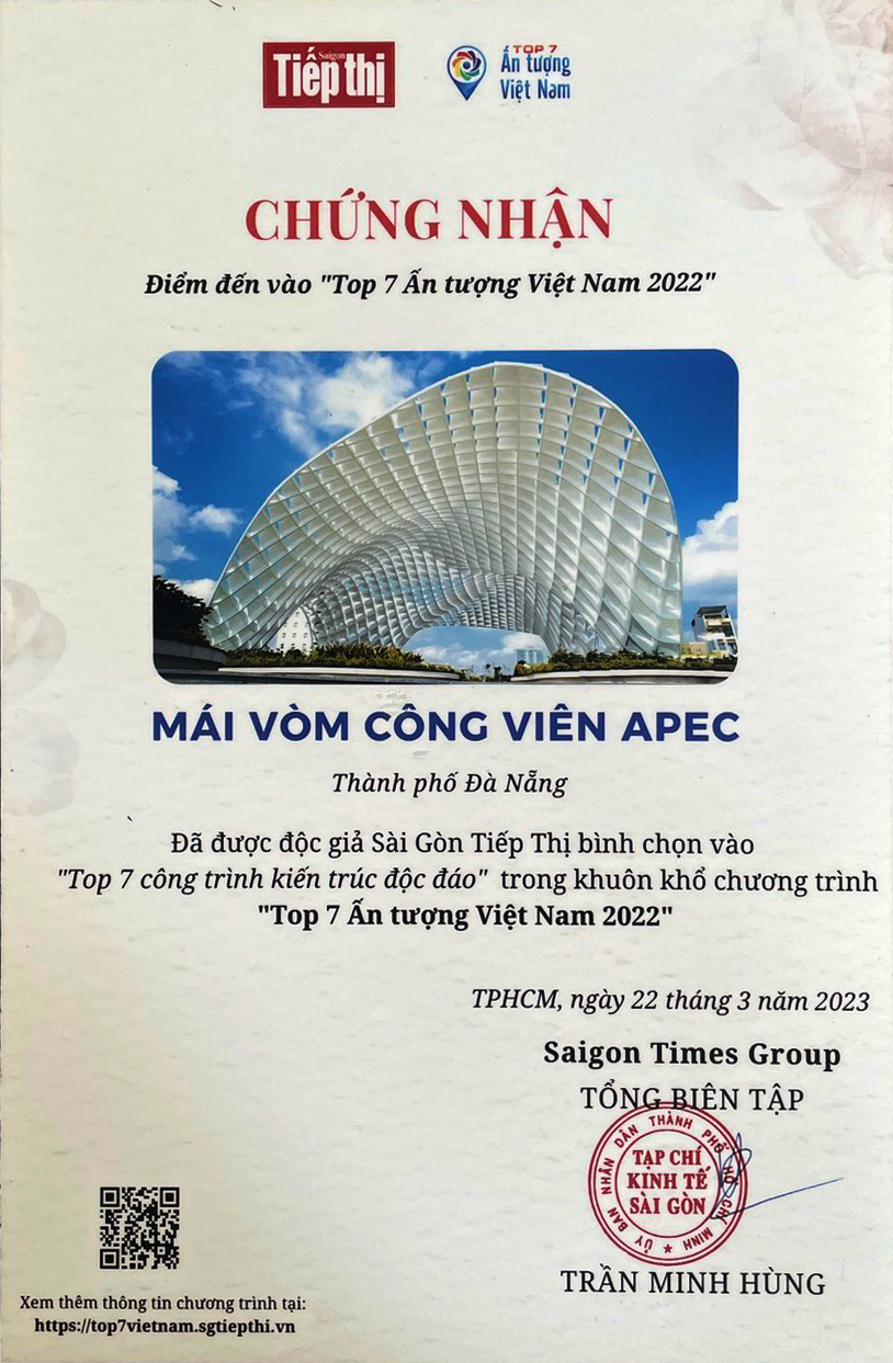 Cuộc thi top 7 ấn tượng Việt Nam được diễn ra hằng năm của báo Kinh tế Sài Gòn. Cuộc thi nhằm tìm ra những cảnh đẹp ấn tượng nhất Việt Nam trong năm. Năm nay, cuộc thi đã chọn ra 35 điểm đến thuộc 5 hạng mục trong “Top 7 Ấn tượng Việt Nam 2022” – trong đó có công trình kiến trúc Mái vòm công viên APEC Đà Nẵng– Công trình kết cấu thép do HGPT Mechanical gia công lắp đặt.