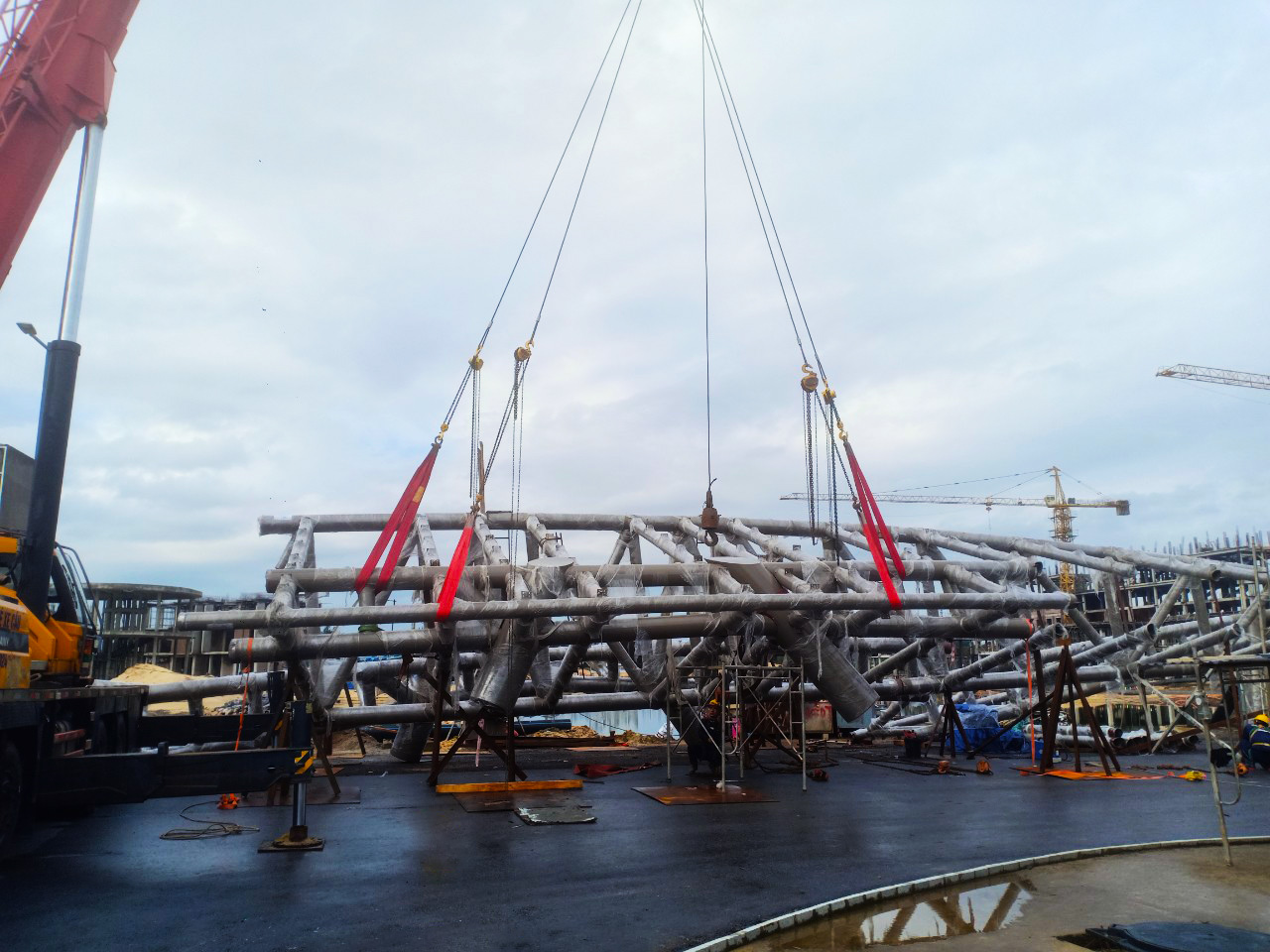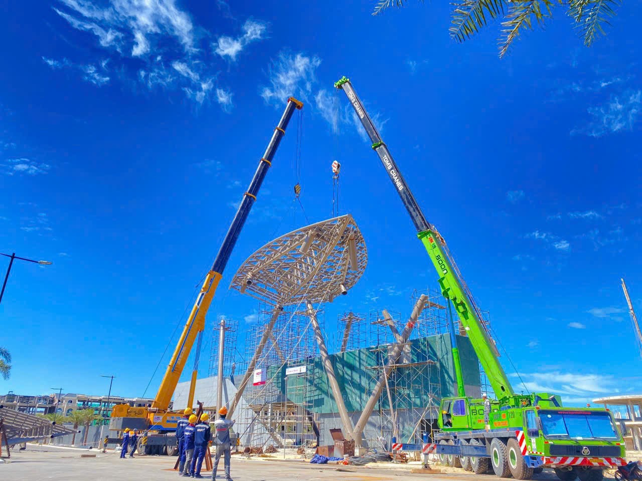 Để những mảnh kết cấu thép có kích thước lớn được liên kết chính xác và an toàn tại công trình, HGPT đã sử dụng 3 xe cẩu chuyên dụng, trong đó cẩu lớn nhất có trọng tải lên đến 300 tấn.